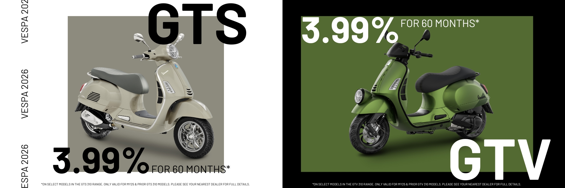 (4) 3.99% for 60 Months [3.99% APR*] Installment Promo – *Example: On a purchase where the Amount Financed is $7,110, your Down Payment is $789 with 60 monthly payments of $130.91 each. Interest Rate is 3.99% [ANNUAL PERCENTAGE RATE 3.99% (E)]. Note: The above financing programs are offered by Synchrony Bank. Subject to credit approval. Approval, and any rates and terms provided, are based on credit worthiness. Other financing offers are available. See your local dealer for details. Minimum Amount Financed $2,500; Maximum Amount Financed $50,000. Other qualifications and restrictions may apply. An origination fee of $125.00 will be added to the amount financed in the above example. Financing promotions void where prohibited. Offer effective on eligible and qualified Vespa MY25 & Prior GTS and GTV models from a participating Synchrony dealer. The $7,110 Amount Financed is estimated with qualified Vespa GTS 300 MY25 with a MSRP $7,899 minus $789 Down Payment. Amount Financed excludes taxes, title, and license fees. Other fees may apply. See dealer for product eligibility and qualifications between 01/01/2026 through 03/31/2026. Offer subject to change without notice. [“E” means estimate.]